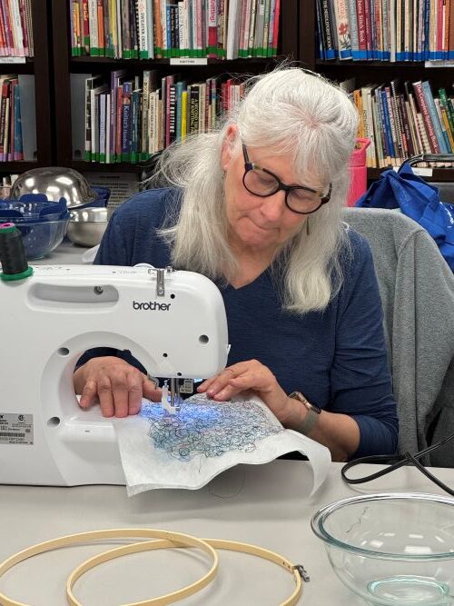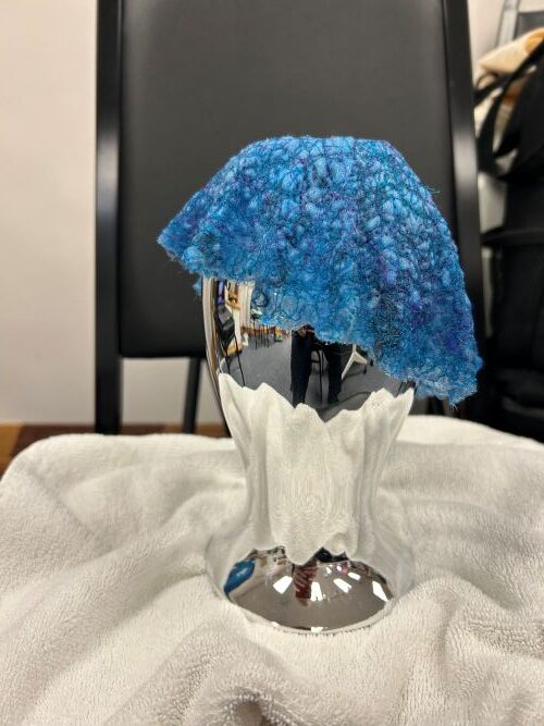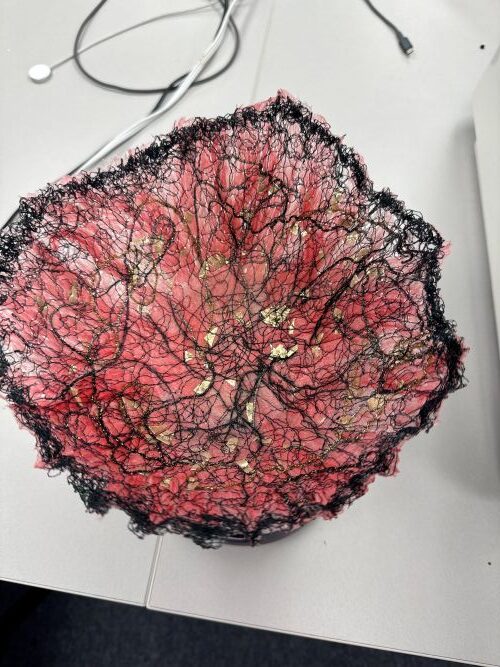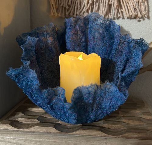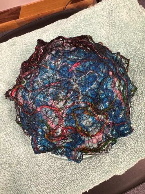 Roving, yarn scraps, and anything light and airy like small bits of fabric lace, ribbon, etc. were used to create the bowls. Class participants laid out their designs on a pieces of water soluble material in an embroidery hoop. Then, used the free motion quilt setting on a sewing machine to tie it all down. The fledgling bowls were then wet & shaped around a glass vessel. Once dry the beautiful bowl was complete.